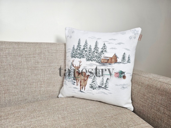 Poszewka gobelinowa motywem reniferów na białym tle.