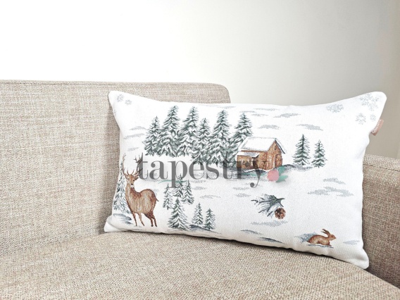 Poszewka gobelinowa motywem reniferów na białym tle.